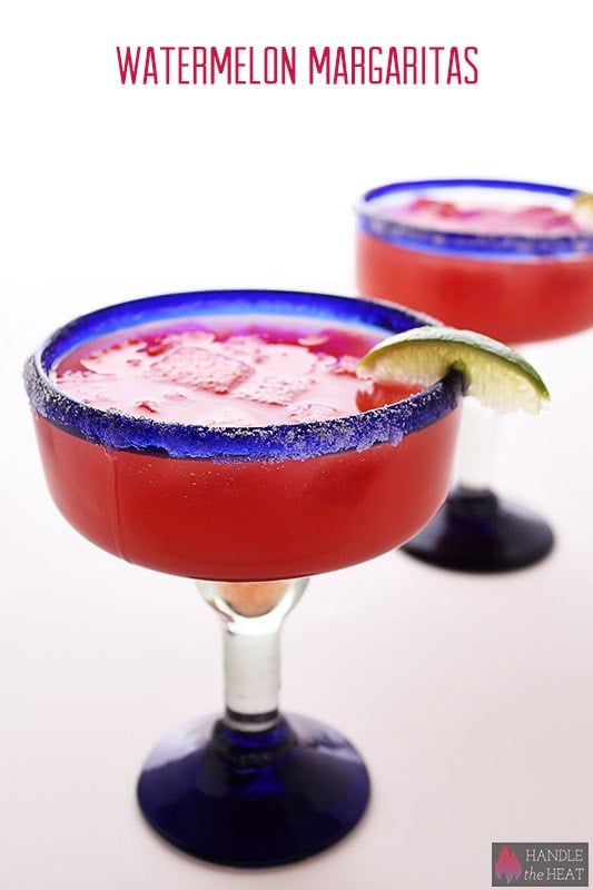 Directions: Cut up half the watermelon into cubes and puree it in a blender. Cut the other half into cubes and place them on a plate in the freezer. Once the watermelon is ready in the blender, combine 2 cups of it with the tequila, lime juice and Triple Sec in a pitcher and stir. If the cubed watermelon is frozen, place a few in each glass and pour the margarita mixture over them. Salt or sugar on the rims of the glasses is optional.